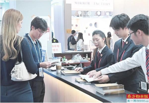 广州市海珠区人民检察院检察官联合现场工作人员向采购商讲解广交会会场结构,并介绍知识产权检察职能。
